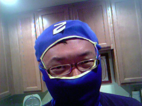 I wanted to put it on and then go check the mail, but my wife dissuaded me from that notion. I did, however, don the party ranger #2 mask with sincerity and gladness of heart in our kitchen, as evidenced below: